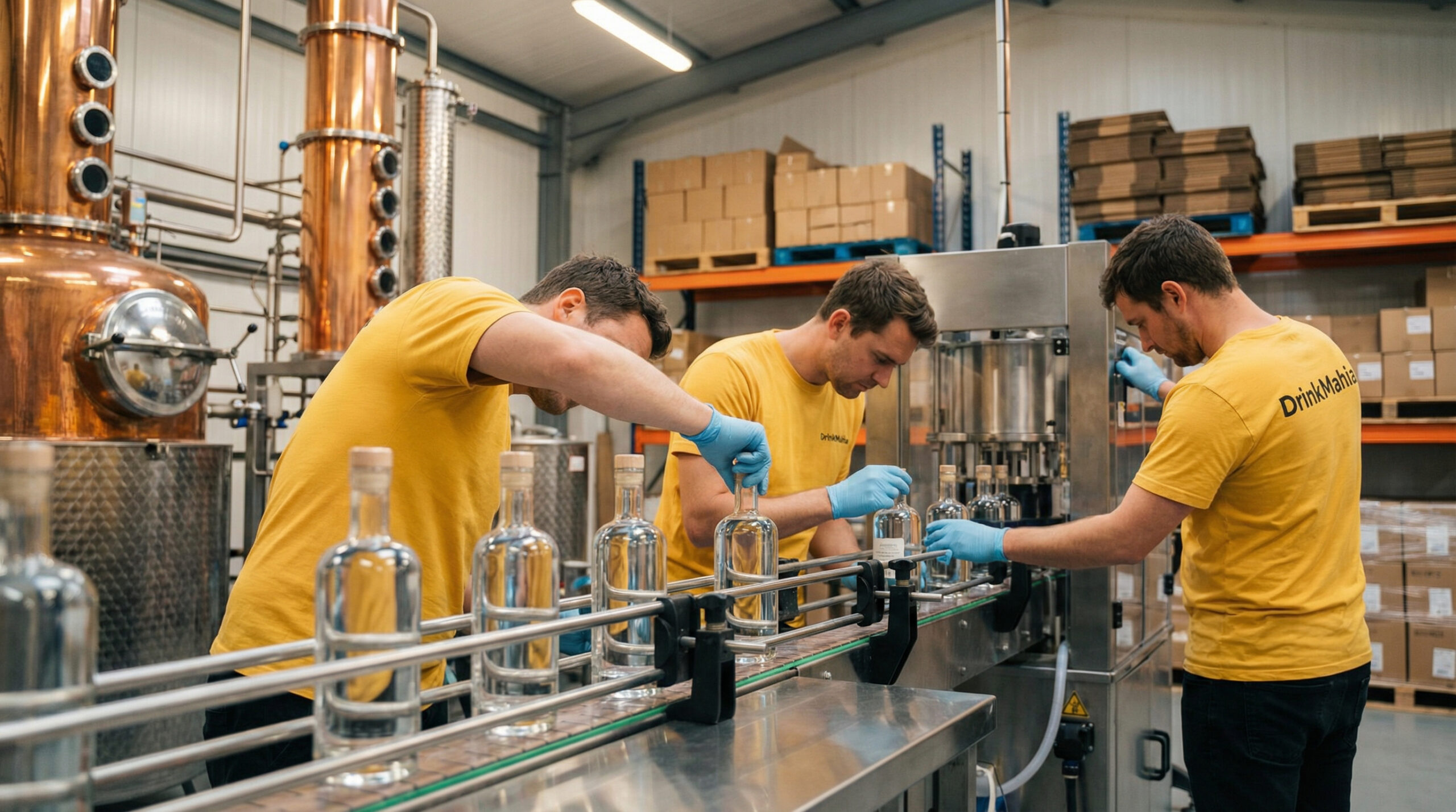 sourcing → formulation → fermentation → distillation → proofing → bottling → compliance → packaging → logistics